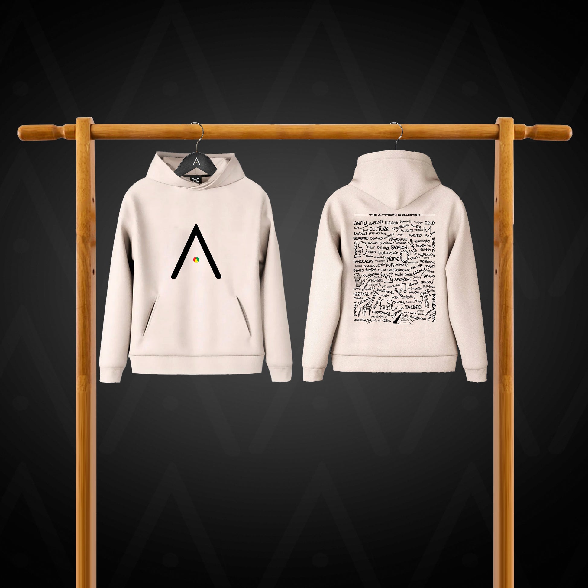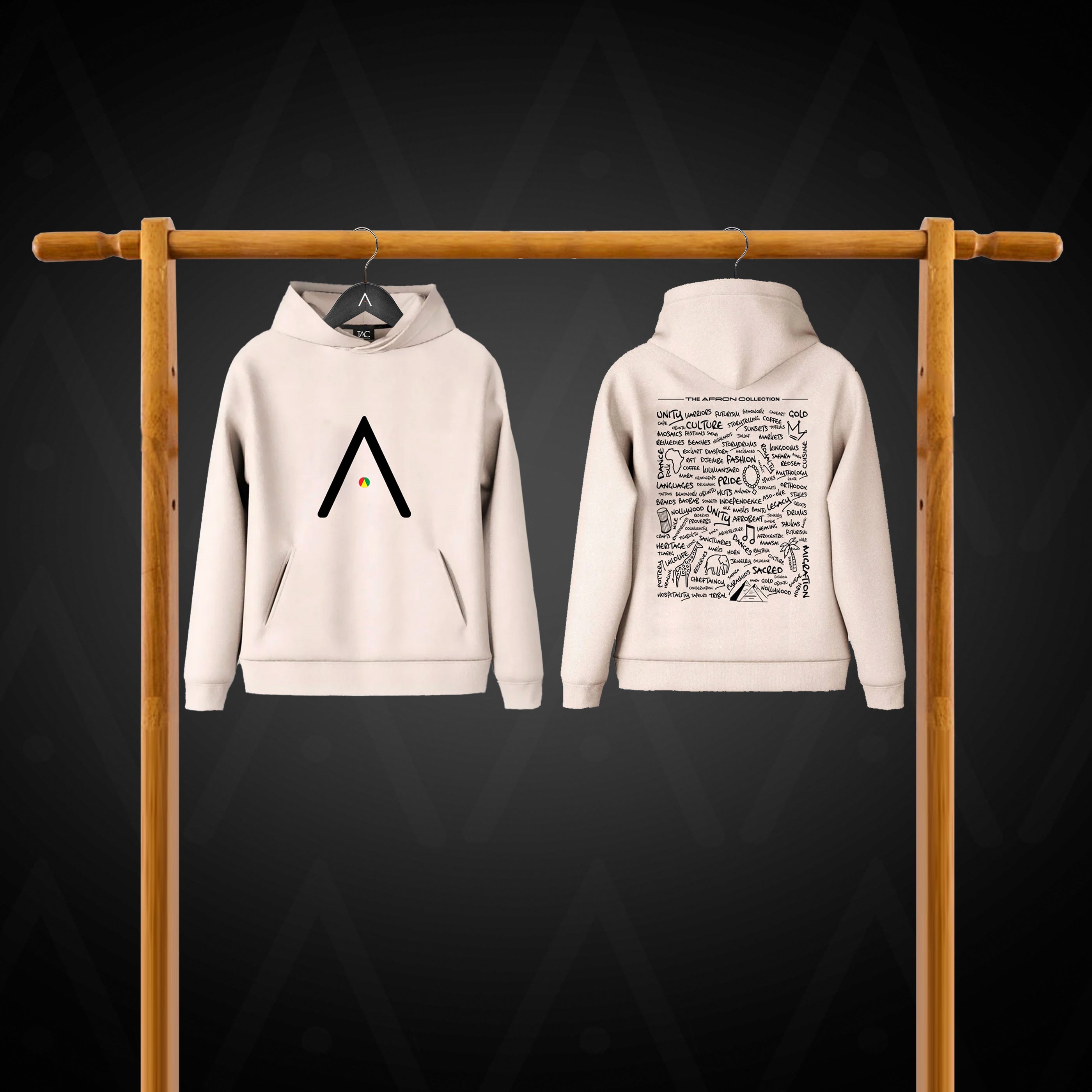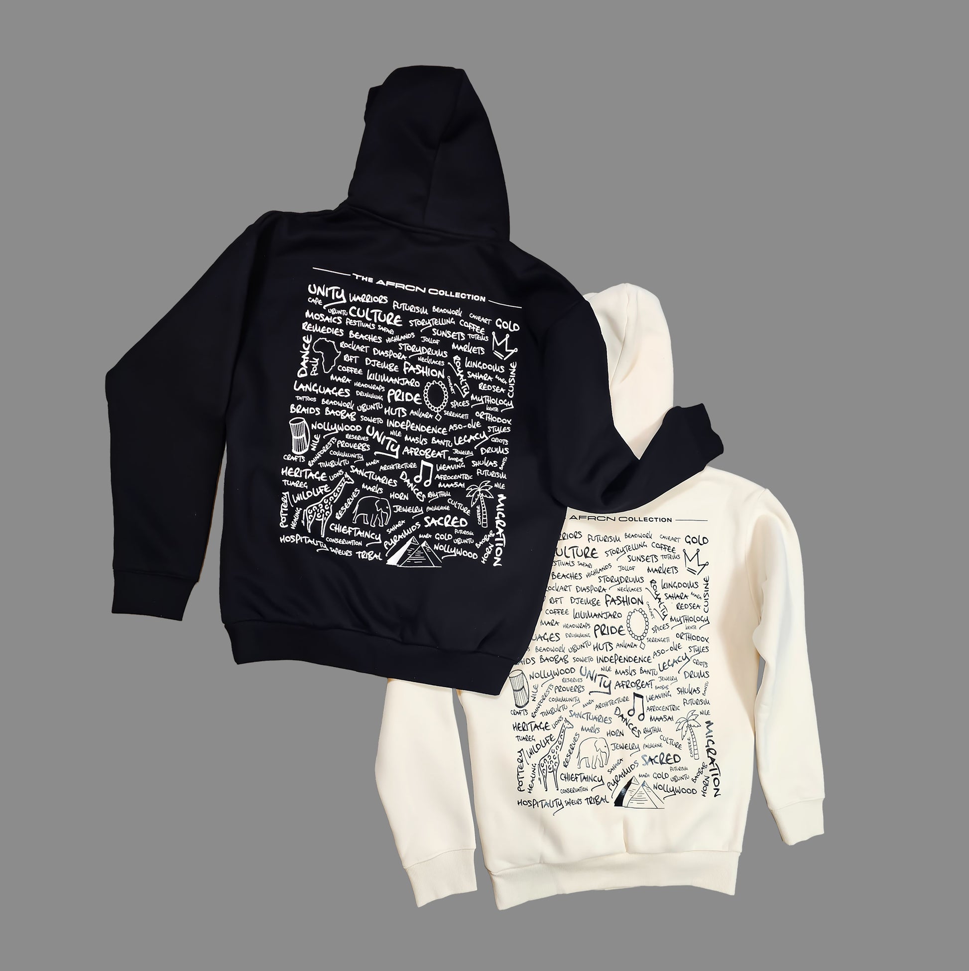 The Herittangible Hoodie boasts an oversized fit. The back features a myriad representation of all things African in textured glossy print and the front features our bold Favicon Logo in embroidery print.